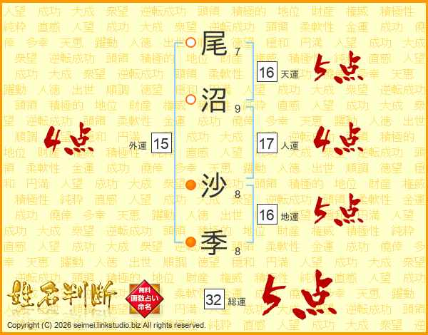 尾沼沙季さんの総運は32画の5点!
