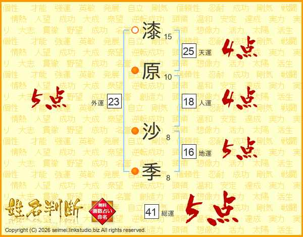 漆原沙季さんの総運は41画の5点!
