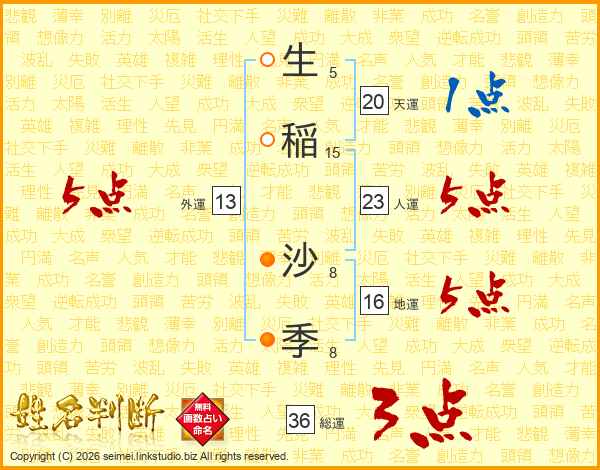 生活面を象徴する運勢です。外部から受ける影響力を表し、結婚運、家庭運や職場、環境への順応性を表します。総運から人運を引いた画数。姓や名が1文字の場合を除く。