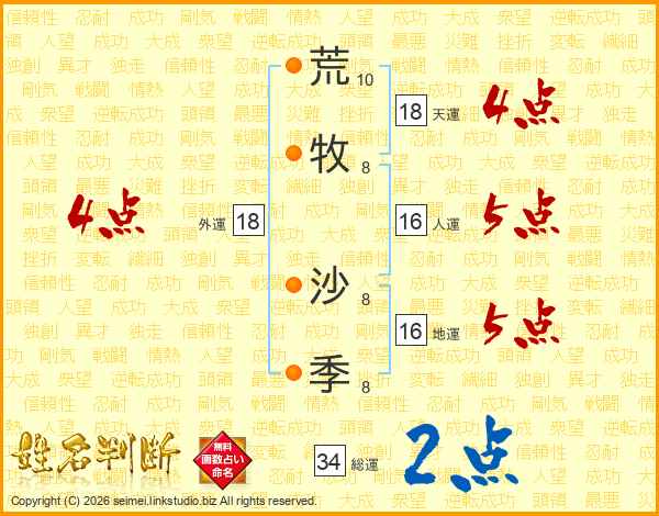 荒(10画)牧(8画) 沙(8画)季(8画)
