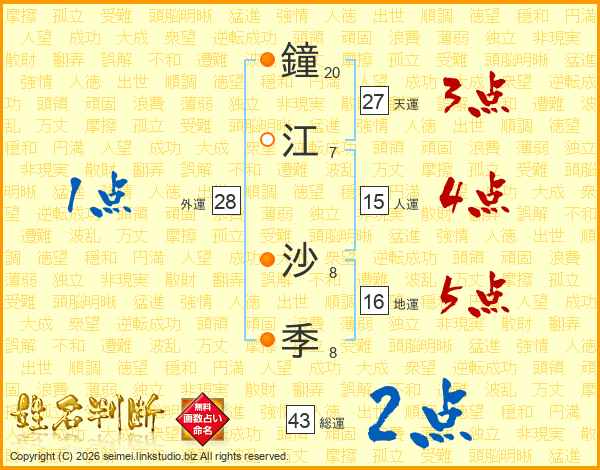 鐘江沙季さんの総運は43画の2点!