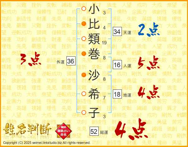 小(3画)比(4画)類(19画)巻(8画) 沙(8画)希(7画)子(3画)