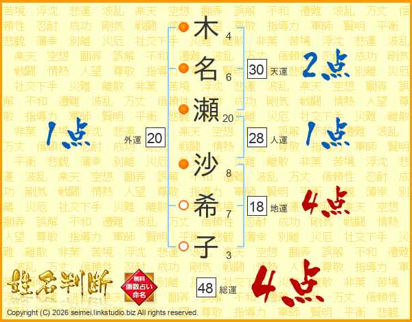 木(4画)名(6画)瀬(20画) 沙(8画)希(7画)子(3画)