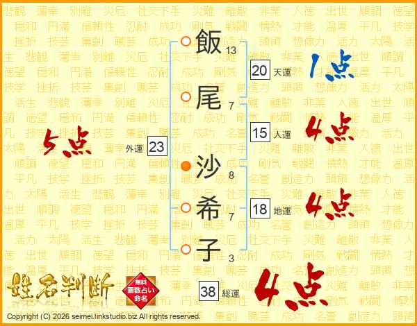 飯(13画)尾(7画) 沙(8画)希(7画)子(3画)