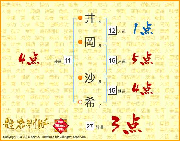 生活面を象徴する運勢です。外部から受ける影響力を表し、結婚運、家庭運や職場、環境への順応性を表します。総運から人運を引いた画数。姓や名が1文字の場合を除く。