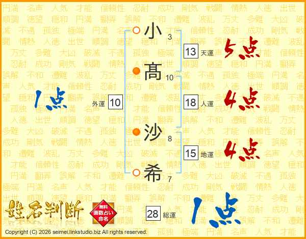 生活面を象徴する運勢です。外部から受ける影響力を表し、結婚運、家庭運や職場、環境への順応性を表します。総運から人運を引いた画数。姓や名が1文字の場合を除く。