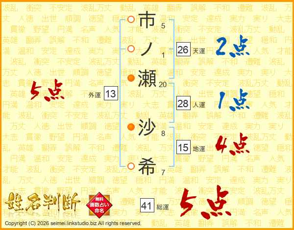 市(5画)ノ(1画)瀬(20画) 沙(8画)希(7画)
