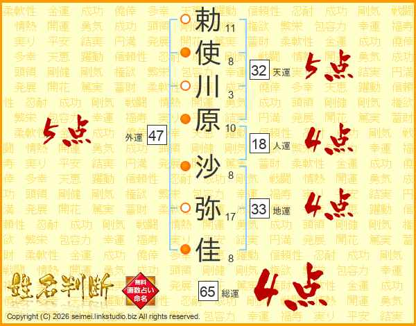 勅(11画)使(8画)川(3画)原(10画) 沙(8画)弥(17画)佳(8画)
