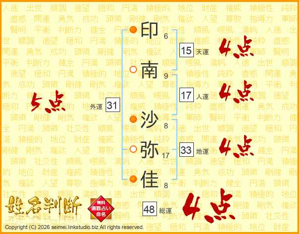 印(6画)南(9画) 沙(8画)弥(17画)佳(8画)