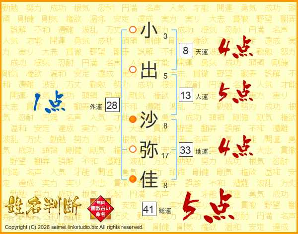 小(3画)出(5画) 沙(8画)弥(17画)佳(8画)