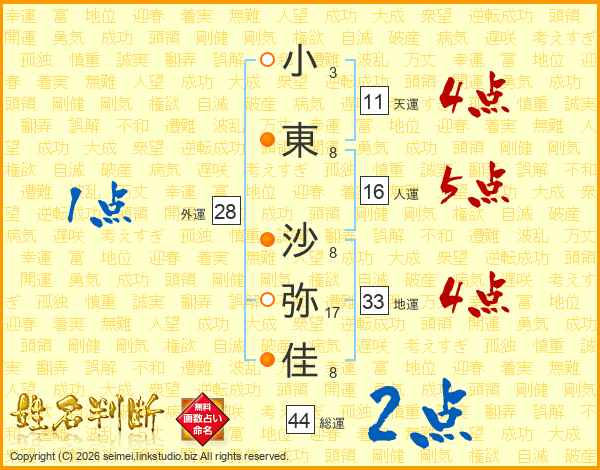 小(3画)東(8画) 沙(8画)弥(17画)佳(8画)