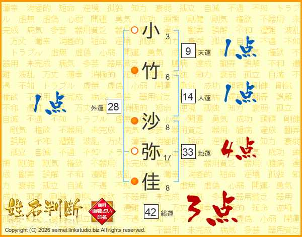 小(3画)竹(6画) 沙(8画)弥(17画)佳(8画)