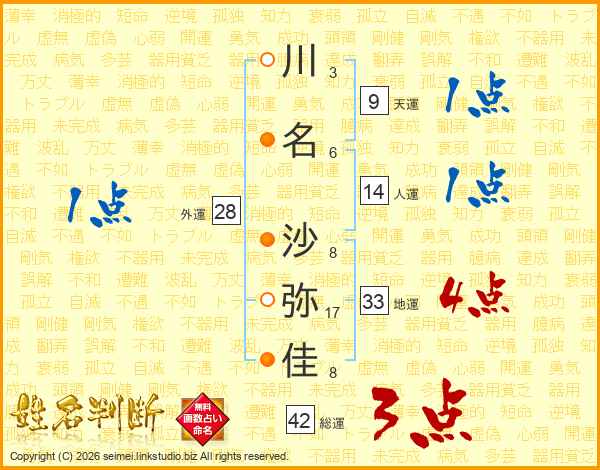 川(3画)名(6画) 沙(8画)弥(17画)佳(8画)