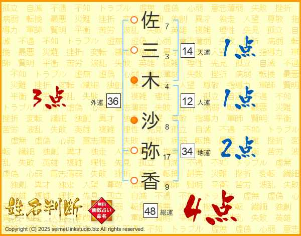 佐(7画)三(3画)木(4画) 沙(8画)弥(17画)香(9画)