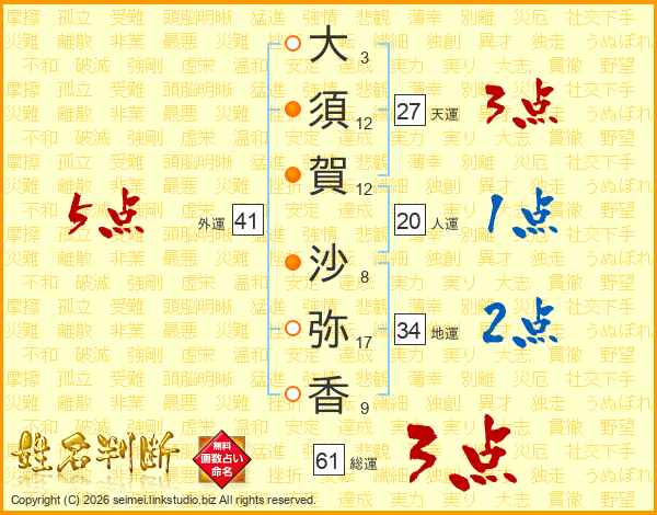 大(3画)須(12画)賀(12画) 沙(8画)弥(17画)香(9画)