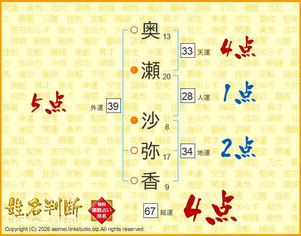 奥(13画)瀬(20画) 沙(8画)弥(17画)香(9画)