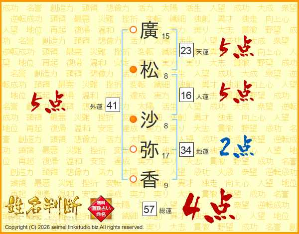 廣(15画)松(8画) 沙(8画)弥(17画)香(9画)