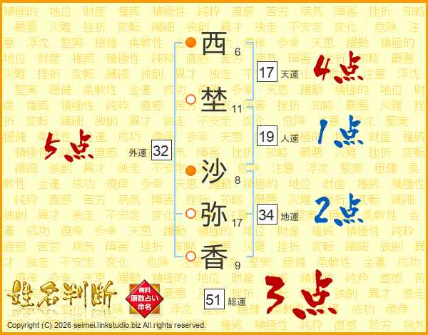 西(6画)埜(11画) 沙(8画)弥(17画)香(9画)