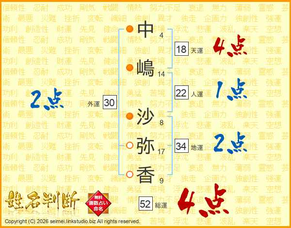 中(4画)嶋(14画) 沙(8画)弥(17画)香(9画)