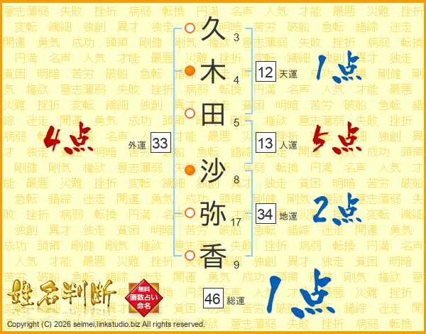 久(3画)木(4画)田(5画) 沙(8画)弥(17画)香(9画)