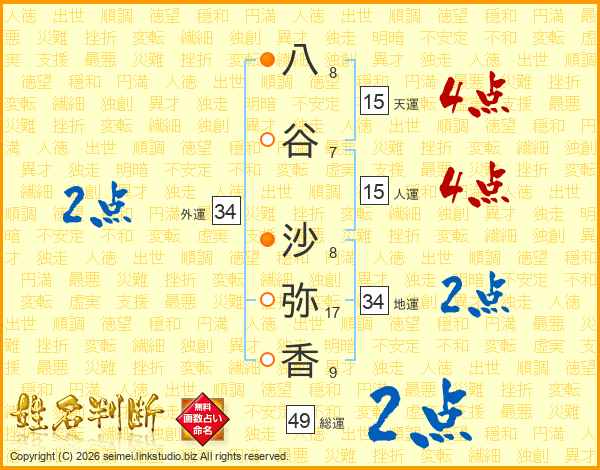 八(8画)谷(7画) 沙(8画)弥(17画)香(9画)