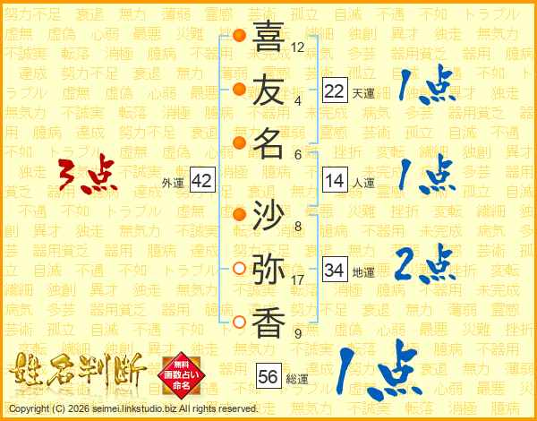 喜(12画)友(4画)名(6画) 沙(8画)弥(17画)香(9画)
