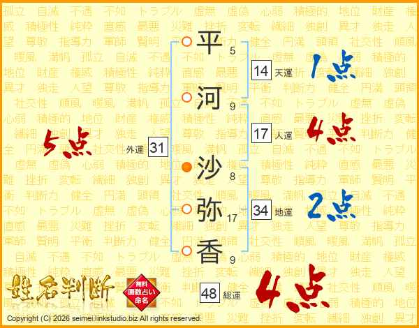 平(5画)河(9画) 沙(8画)弥(17画)香(9画)