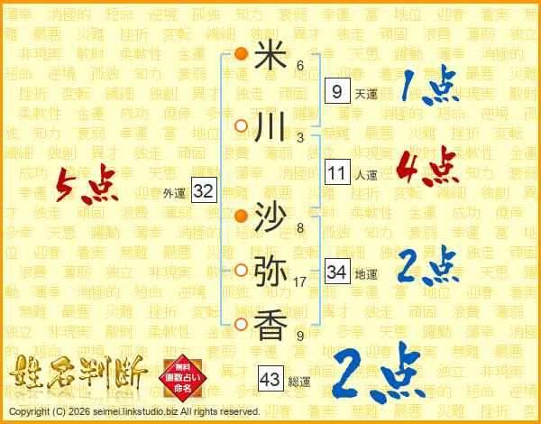 米(6画)川(3画) 沙(8画)弥(17画)香(9画)
