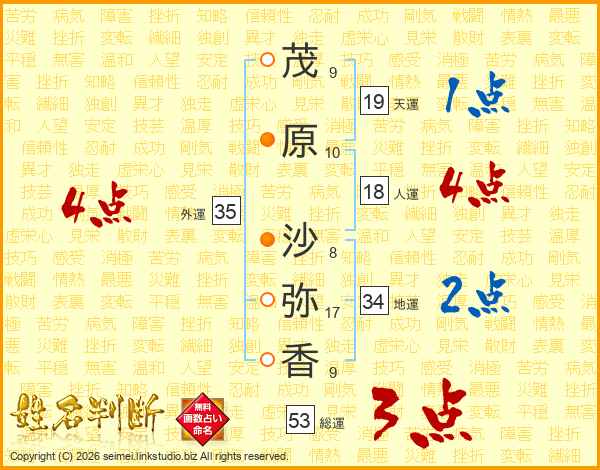 茂(9画)原(10画) 沙(8画)弥(17画)香(9画)