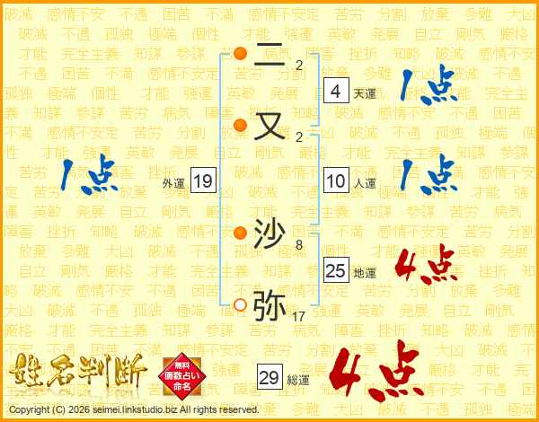 生活面を象徴する運勢です。外部から受ける影響力を表し、結婚運、家庭運や職場、環境への順応性を表します。総運から人運を引いた画数。姓や名が1文字の場合を除く。