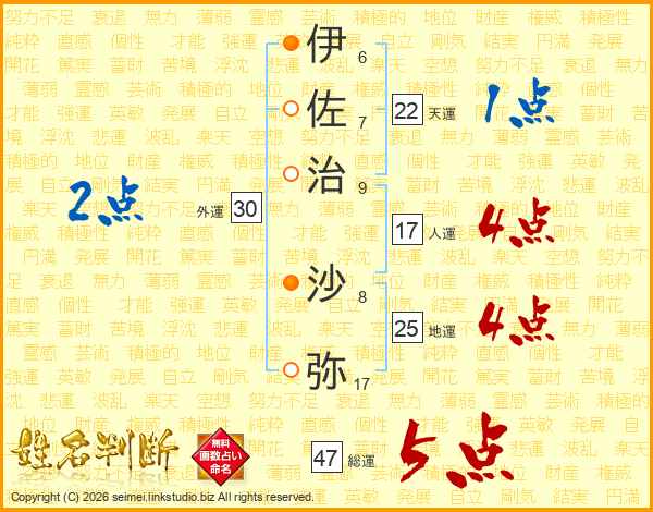 伊(6画)佐(7画)治(9画) 沙(8画)弥(17画)