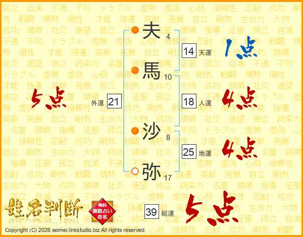 夫馬沙弥さんの総運は39画の5点!