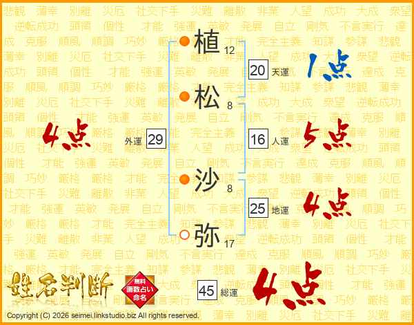 生活面を象徴する運勢です。外部から受ける影響力を表し、結婚運、家庭運や職場、環境への順応性を表します。総運から人運を引いた画数。姓や名が1文字の場合を除く。