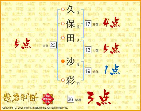 久(3画)保(9画)田(5画) 沙(8画)彩(11画)