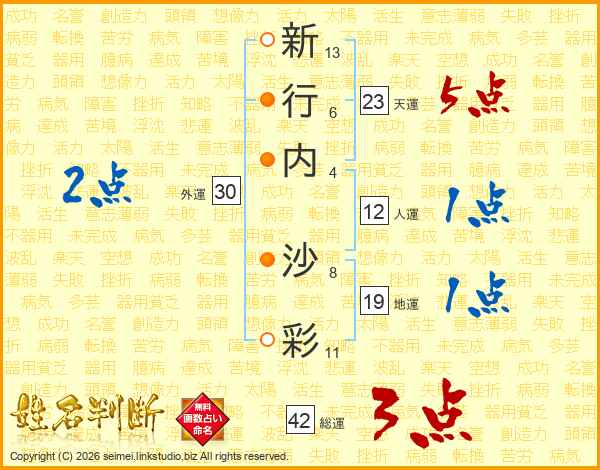 生活面を象徴する運勢です。外部から受ける影響力を表し、結婚運、家庭運や職場、環境への順応性を表します。総運から人運を引いた画数。姓や名が1文字の場合を除く。