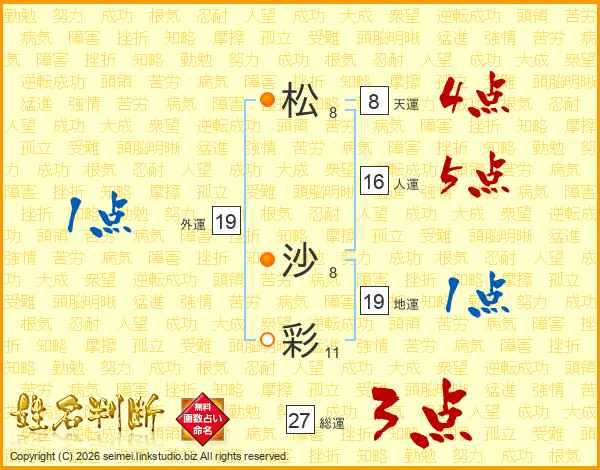 松(8画) 沙(8画)彩(11画)
