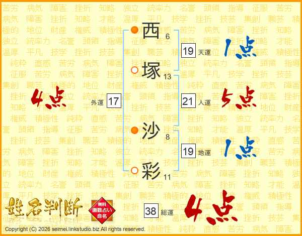 西(6画)塚(13画) 沙(8画)彩(11画)