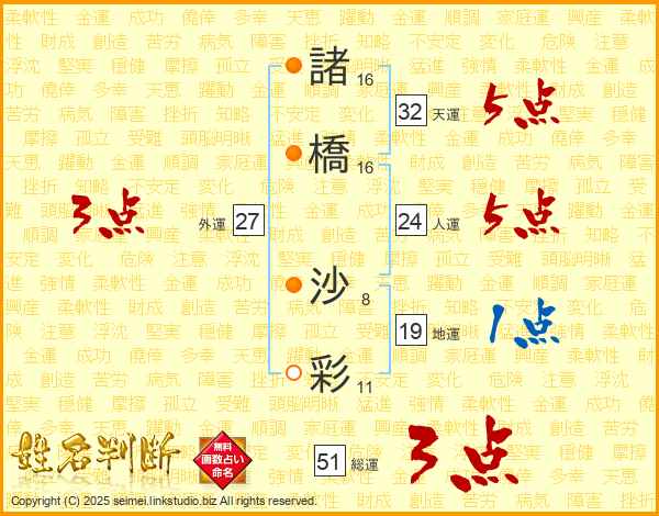 諸(16画)橋(16画) 沙(8画)彩(11画)