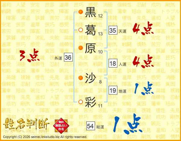 黒(12画)葛(13画)原(10画) 沙(8画)彩(11画)