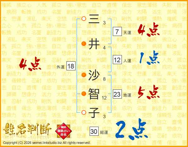 三(3画)井(4画) 沙(8画)智(12画)子(3画)