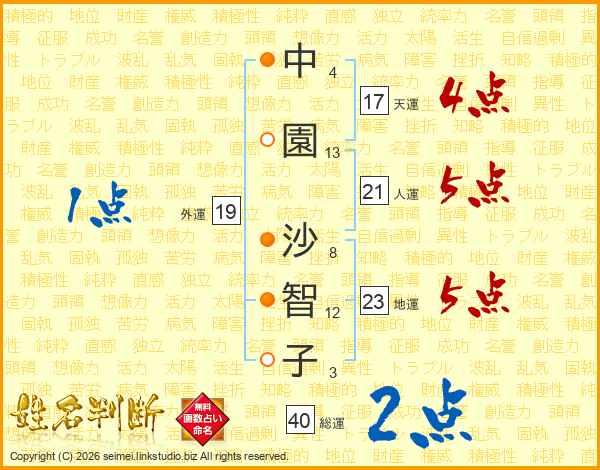 中(4画)園(13画) 沙(8画)智(12画)子(3画)