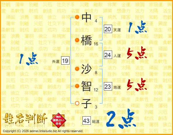 中(4画)橋(16画) 沙(8画)智(12画)子(3画)