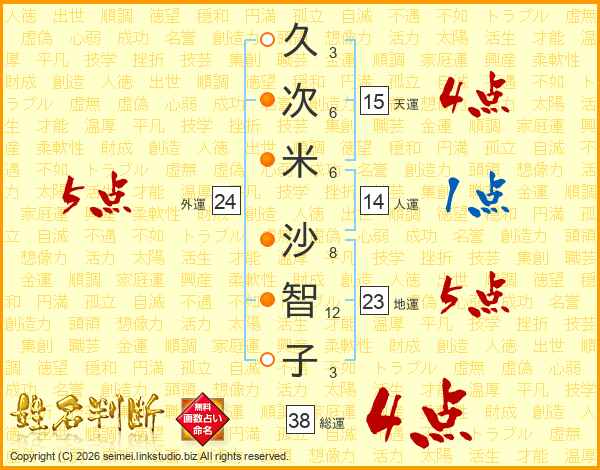 久(3画)次(6画)米(6画) 沙(8画)智(12画)子(3画)