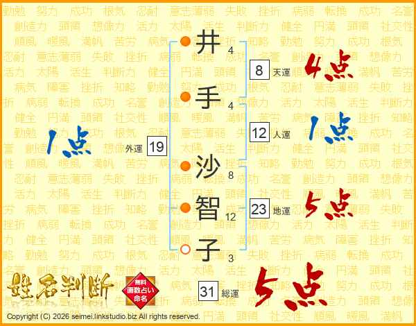 井(4画)手(4画) 沙(8画)智(12画)子(3画)