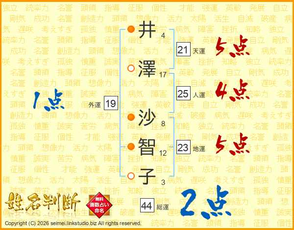 井(4画)澤(17画) 沙(8画)智(12画)子(3画)