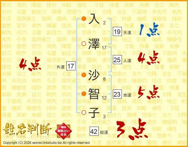 入(2画)澤(17画) 沙(8画)智(12画)子(3画)