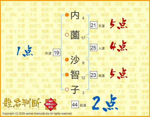 内(4画)薗(17画) 沙(8画)智(12画)子(3画)