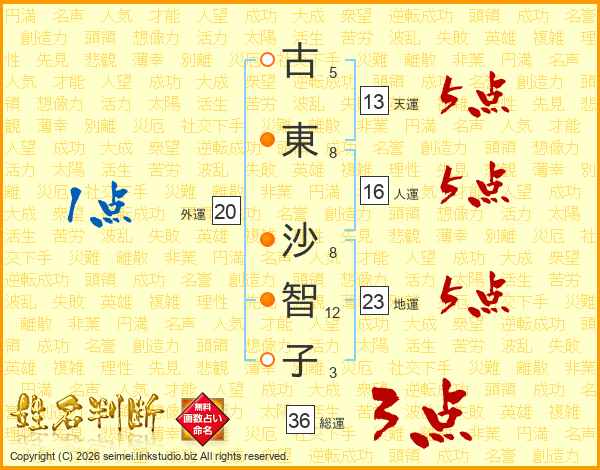 古(5画)東(8画) 沙(8画)智(12画)子(3画)
