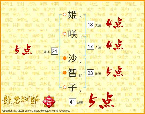 姫咲沙智子さんの総運は41画の5点!