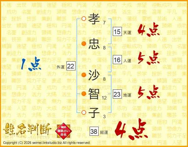 孝(7画)忠(8画) 沙(8画)智(12画)子(3画)
